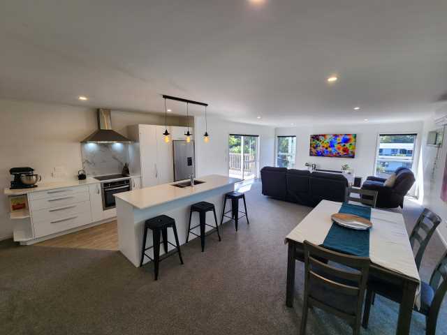 Inside, you’ll find a bright, open-plan kitchen, dining, and living area that enjoys excellent sun throughout the year, creating a warm and inviting atmosphere. The home is cool in summer, warm in winter, and equipped with an air conditioner/heat pump for year-round comfort. The living area flows seamlessly out to a generous sunny deck—ideal for BBQs, relaxing, or entertaining friends and family.