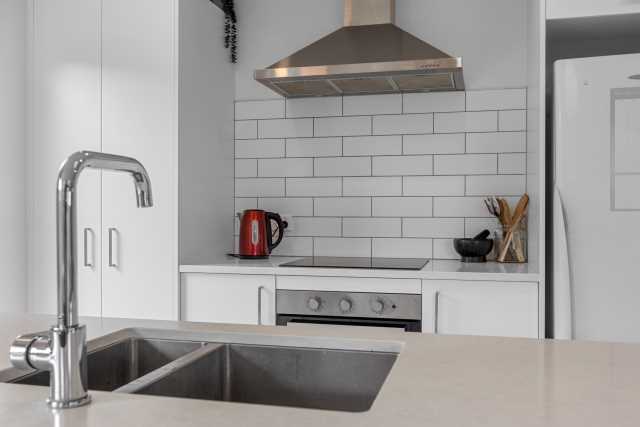 • Stylish kitchen featuring a stone benchtop and a double stainless steel sink.