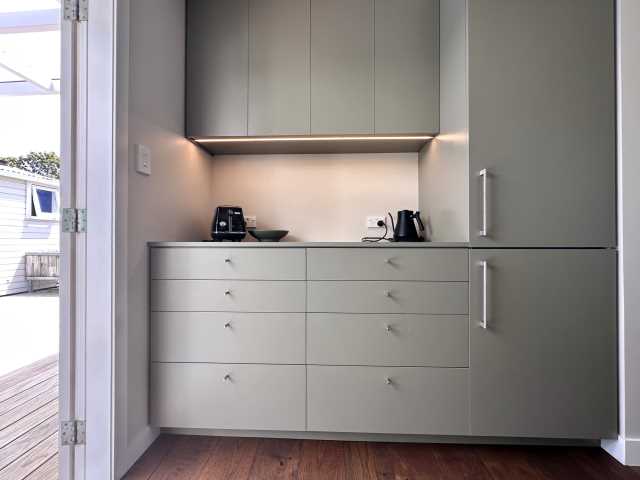A very 'cool' stand-alone office/sleep-out joins the large deck, featuring a wall of cork from Portugal and complete with power and internet.
