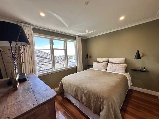 The north-facing living area is bright and spacious. Shutters, floor-to-ceiling curtains, timber flooring, wool carpets and a heat pump give the space elegance and extra comfort. Integrated AV in the living room makes for movie-watching pleasure on the Samsung Frame TV.