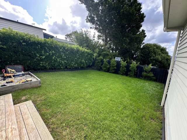 From the kitchen, double French doors open onto a large deck, perfect for entertaining. It has a built-in BBQ pit, integrated audio system and Shade 7 umbrella. Established hedges offer privacy and serenity. The flat lawn is great for the kids, and they will have a lot of fun in the built-in sandpit.