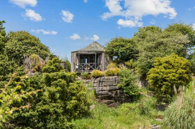 At the opposite end of the property, a self-contained octagonal cabin is privately nestled among the trees and set against a natural rock outcrop. This unique space offers flexible use as guest accommodation, a creative studio, or a quiet retreat surrounded by nature.
