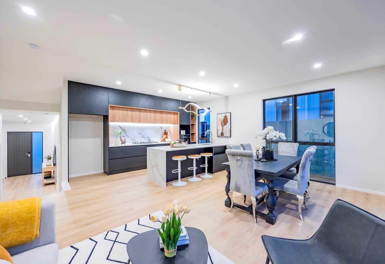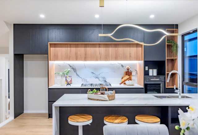 The generous open-plan living and dining areas flow seamlessly to outdoor spaces, perfect for entertaining and everyday family living. A stunning designer kitchen sits at the heart of the home, featuring premium finishes, quality appliances, and a large island bench.