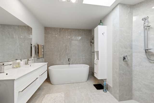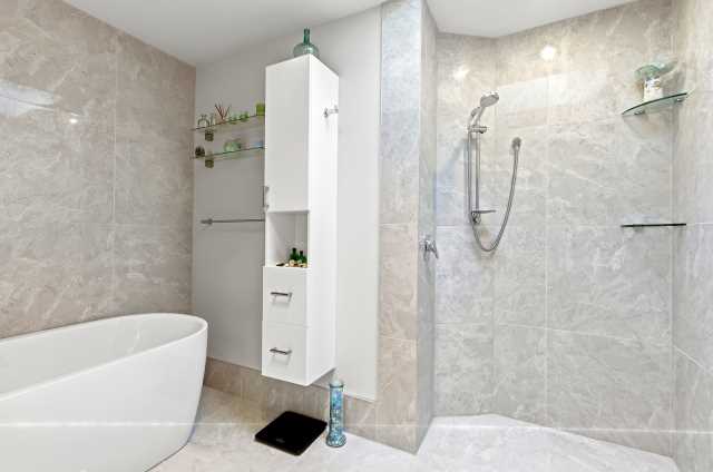 The main bathroom is a true showpiece, boasting a luxurious tiled finish, dual vanity, open shower, and a striking standalone bath designed for relaxation.