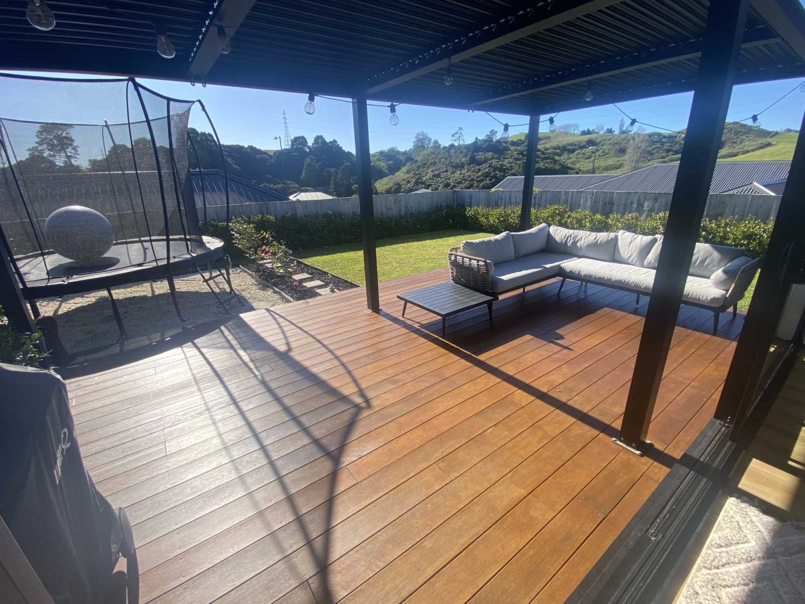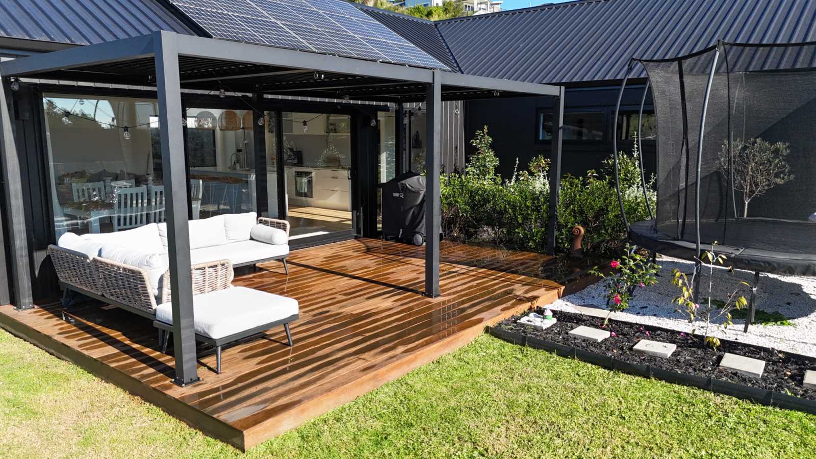 Kwila timber decking at the entrance and rear (approx. 6m x 3.5m), complete with a louvre roof system for year-round outdoor enjoyment