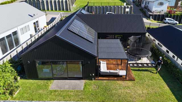 Striking exterior painted in Ebony Black, featuring a mix of vertical weatherboard and bagged brick for bold contrast