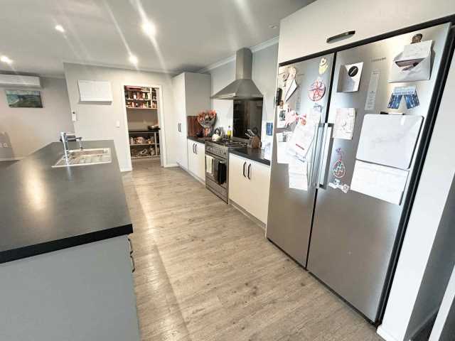 Positioned on an elevated site, the property offers breathtaking 180-degree panoramic views of the rolling Hakarimata and Waingaro hill country, best enjoyed from the expansive deck – perfect for entertaining, relaxing, and soaking in the tranquil surroundings. Step inside through ranch sliders into a light-filled, spacious open-plan kitchen with scullery, dining, and living area, which flows seamlessly into an adjoining lounge and formal living space – all designed to maximise the views and sense of openness.