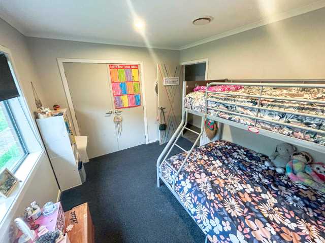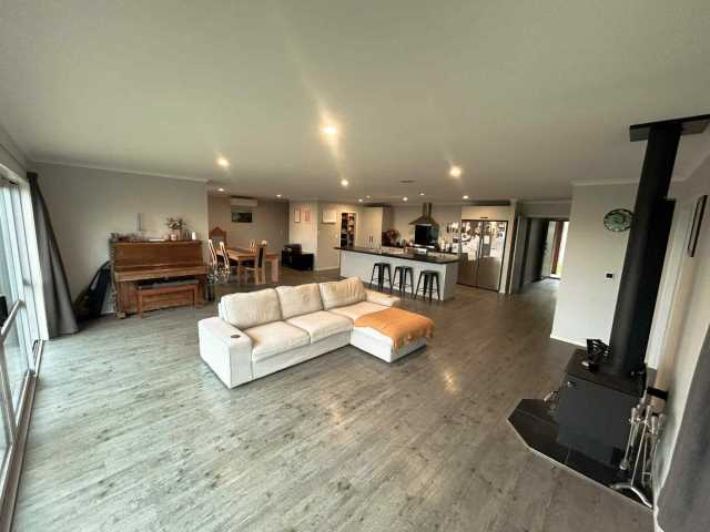 The home is kept cosy with a heat pump and wood burner, which also heats the hot water, supported by a heat transfer system throughout the four bedrooms. Hot water and cooking are both on gas, adding to the efficiency and practicality of off-grid living. The master suite offers a peaceful retreat with an ensuite and walk-in robe, complemented by a main bathroom with shower and toilet, plus an additional separate toilet for convenience.
