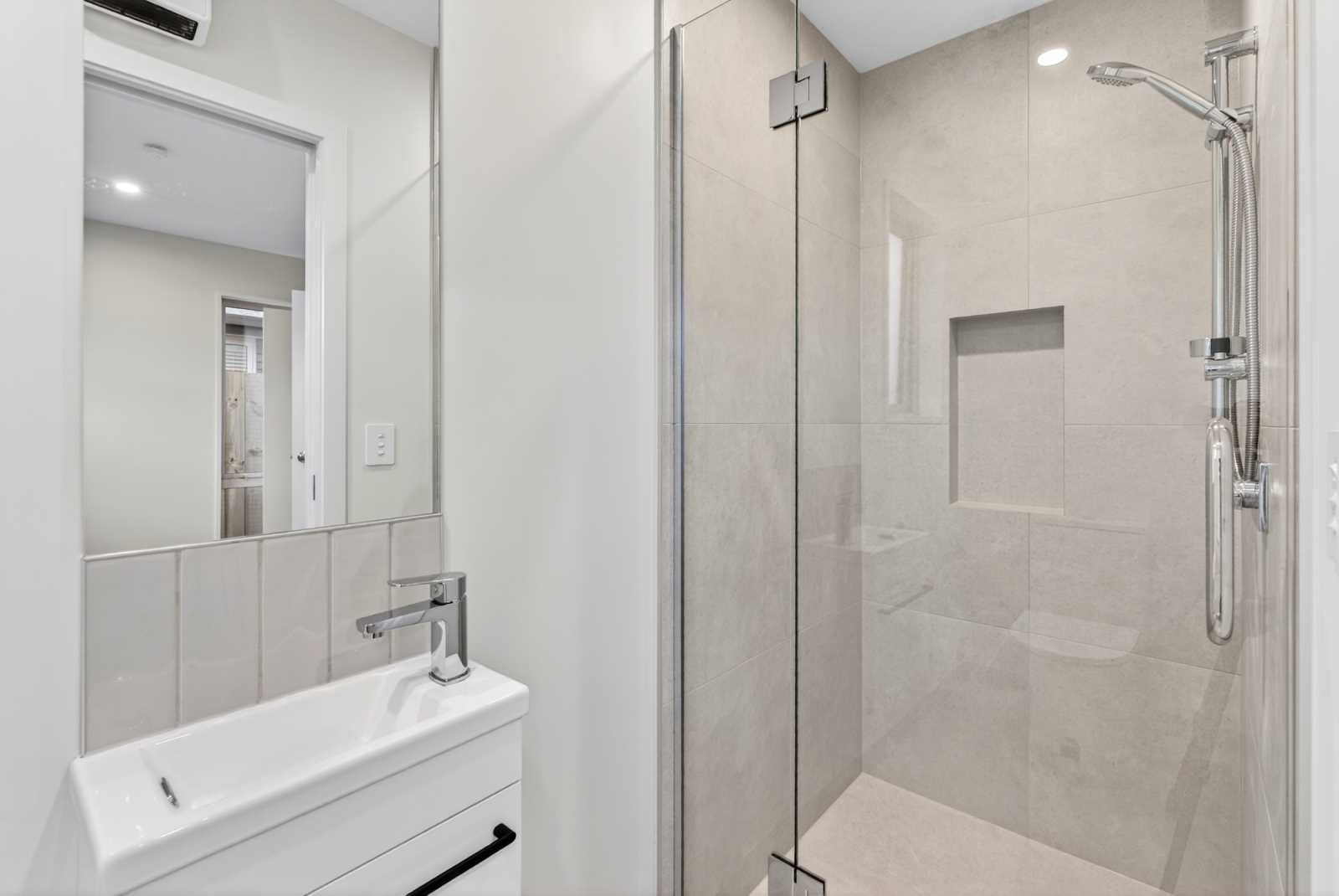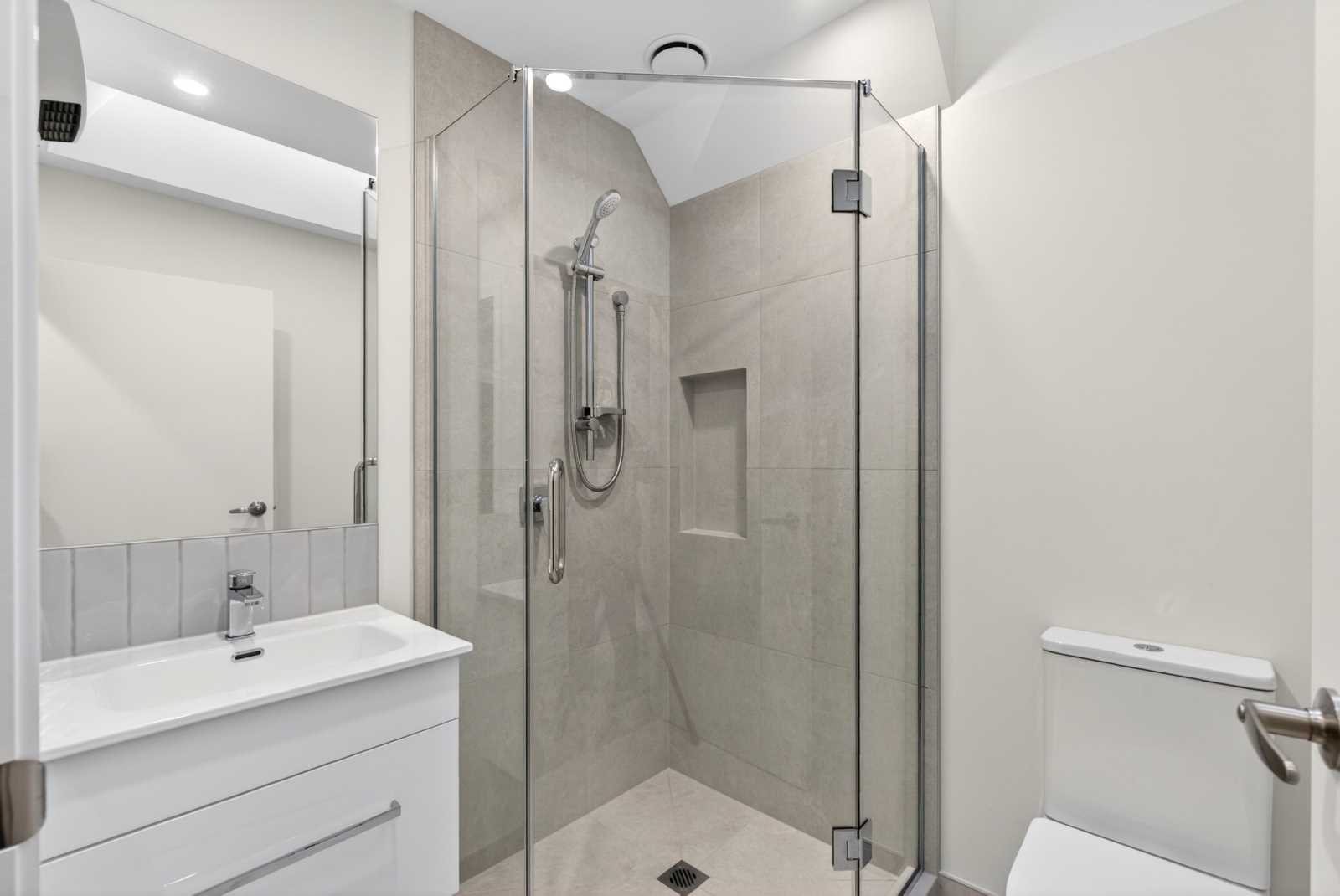 Sleek, tiled bathroom with quality fittings