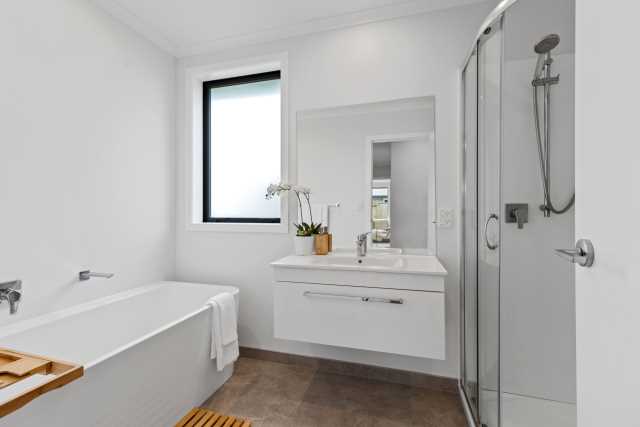 A sleek, contemporary bathroom with quality fixtures for family convenience