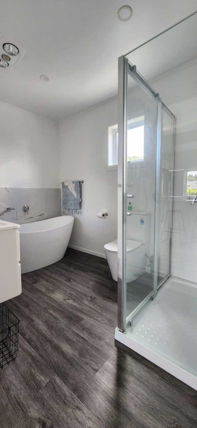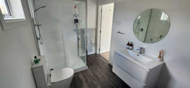 Recent modern bathroom (freestanding bath, large shower with a monsoon shower head, plus slide shower and a heated towel rail