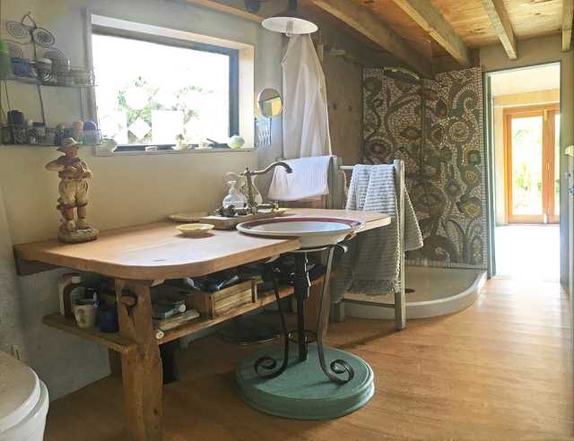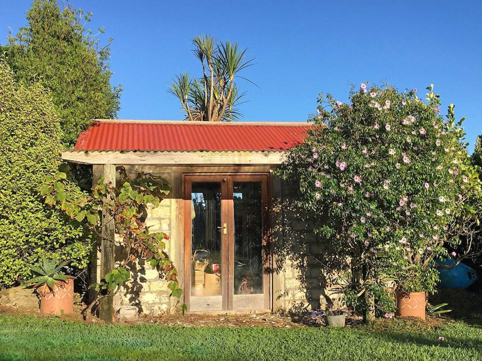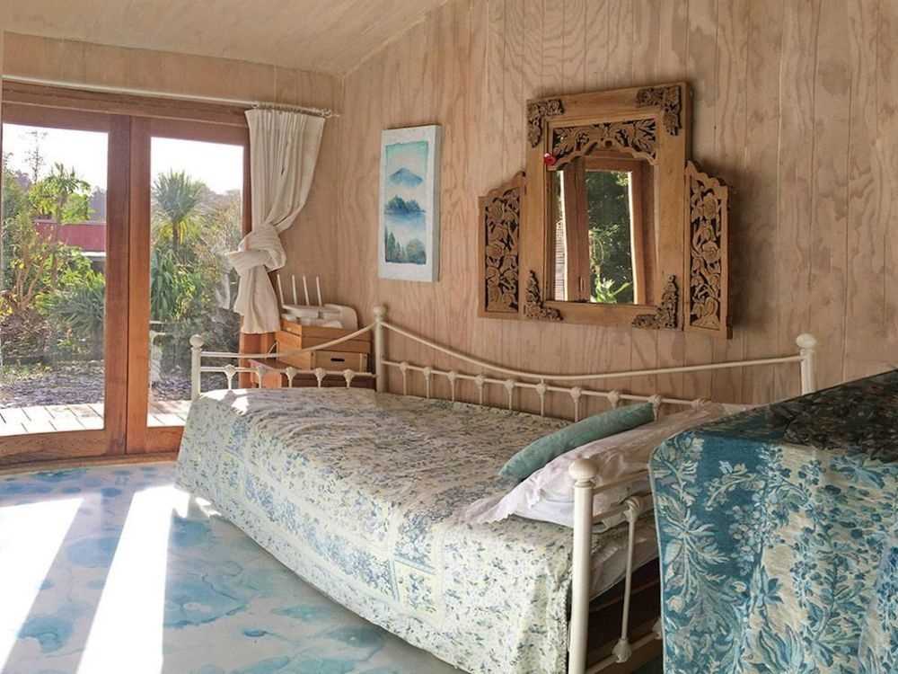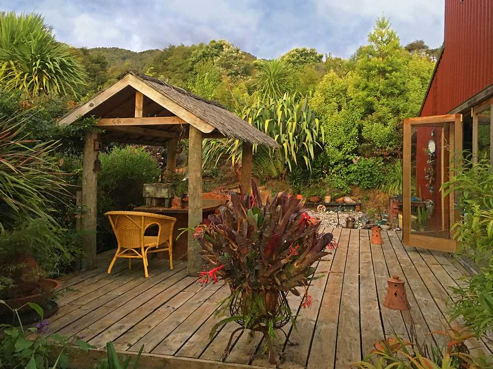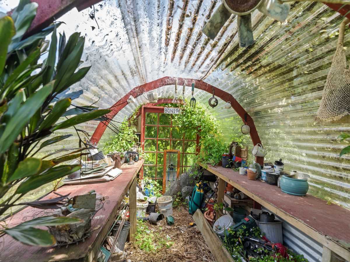 Meandering walkways lead through a well-established orchard, greenhouse and garden with numerous mature plants and native trees. Picturesque bridges provide access over the trickling stream to 3 different wooden cabins plus a mudbrick studio, all enjoying their own private setting.
