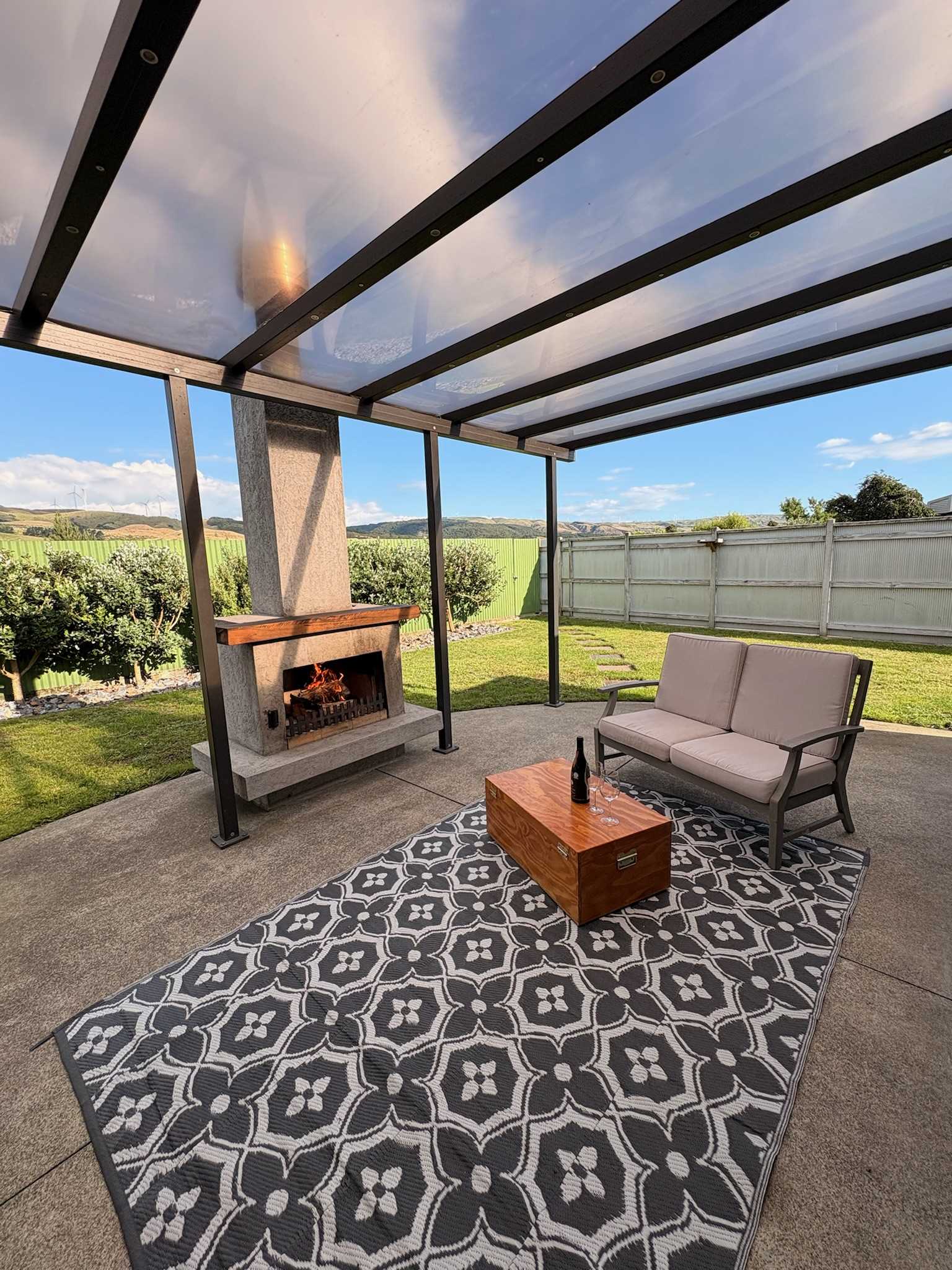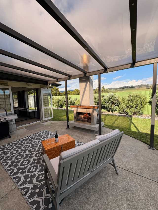 Outside you’ll find an inviting covered outdoor area. Cleverly connected to both indoor living zones, this space is enhanced by an outdoor wood fire, creating a cozy atmosphere for relaxed evenings.