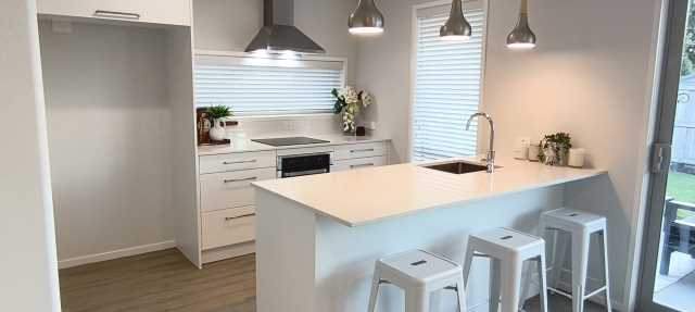 Contemporary design brick and tile with spacious open-plan main living area and modern kitchen with stone benchtops.
