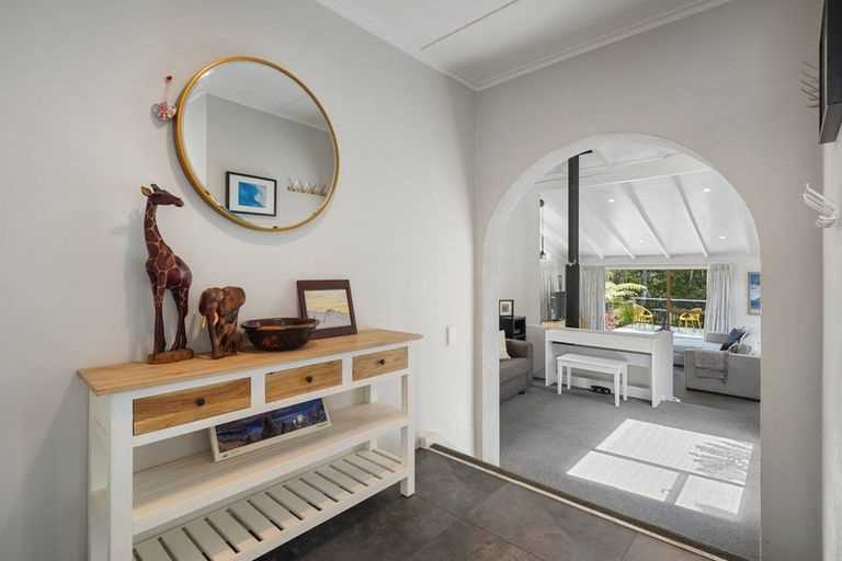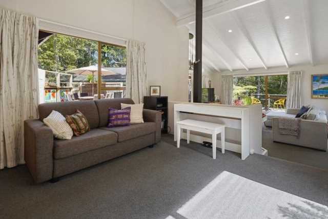 The "east wing" features two lounges and a fireplace with 180 views of native bush. A big open kitchen and dining area with sliding door to outdoor dining space are the heart of this home. A heat pump and underfloor heating keeps this space cozy and warm in winter. The laundry is in the back where there is lawn and existing garden space.