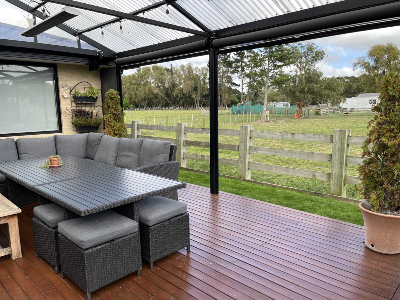Step outside to a generous 32m² covered deck, complete with pull‑down screens so it can be enjoyed year‑round. Positioned to capture the afternoon sun and overlooking the neighboring farm, it’s an inviting space for relaxed dining, entertaining, or unwinding at the end of the day.
