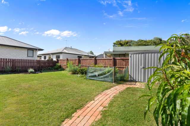 The garden is generously sized front and back, with fruit trees including lime, mandarin, peach and nectarine, together with veggie planter boxes positioned for all day sun for the hobby gardener.