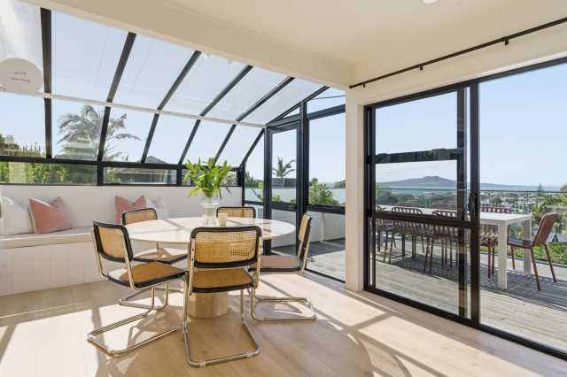 From the moment you step inside, light-filled interiors and a calming coastal outlook create an immediate sense of space and relaxation. The stylish new kitchen flows seamlessly into open-plan living and dining, with large windows and sliding doors framing expansive ocean views out over the Hauraki Gulf to Rangitoto - including those magnificent morning sunrises that never lose their appeal. Here you will find a generous sunny deck, perfect for entertaining or simply soaking in the outlook.